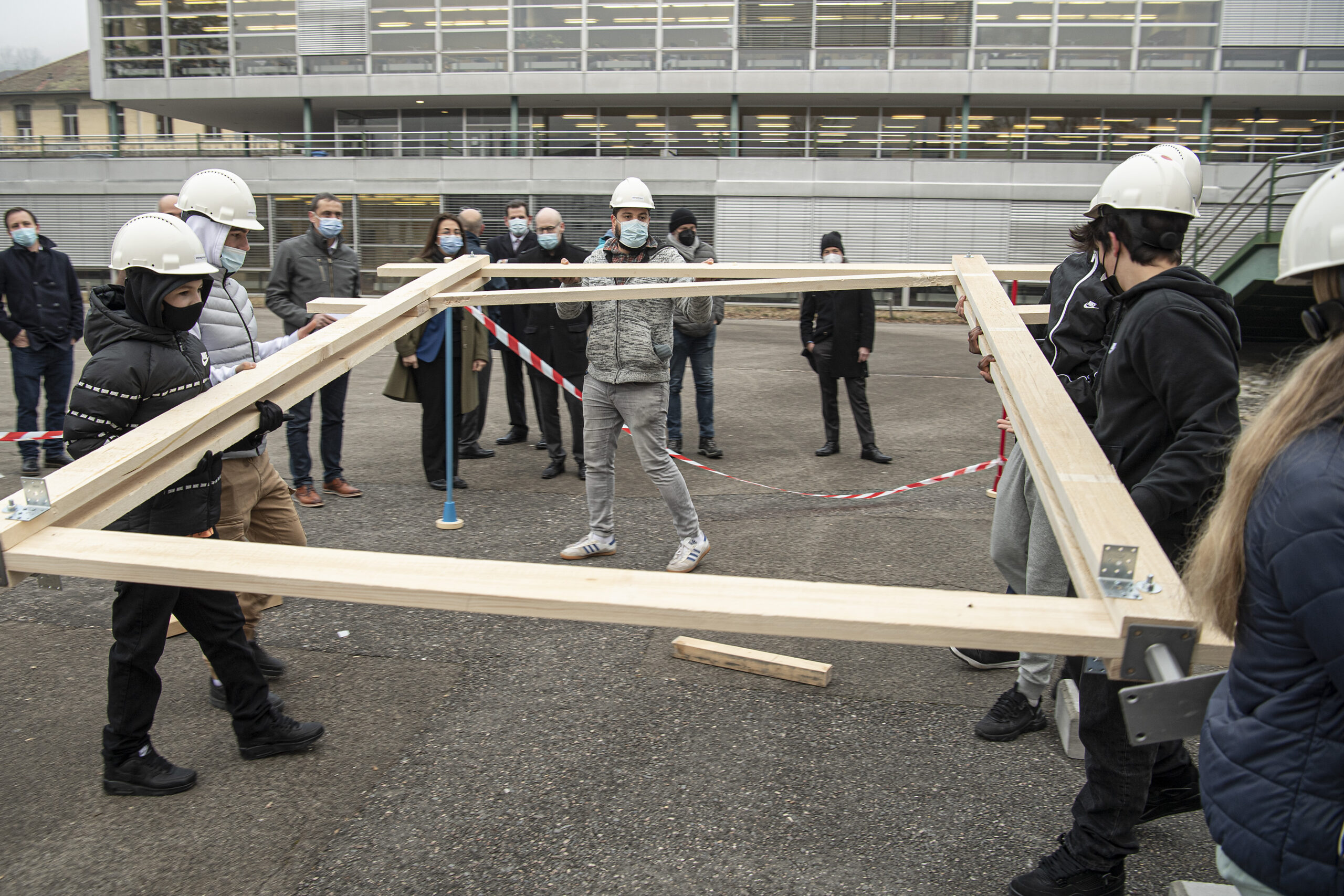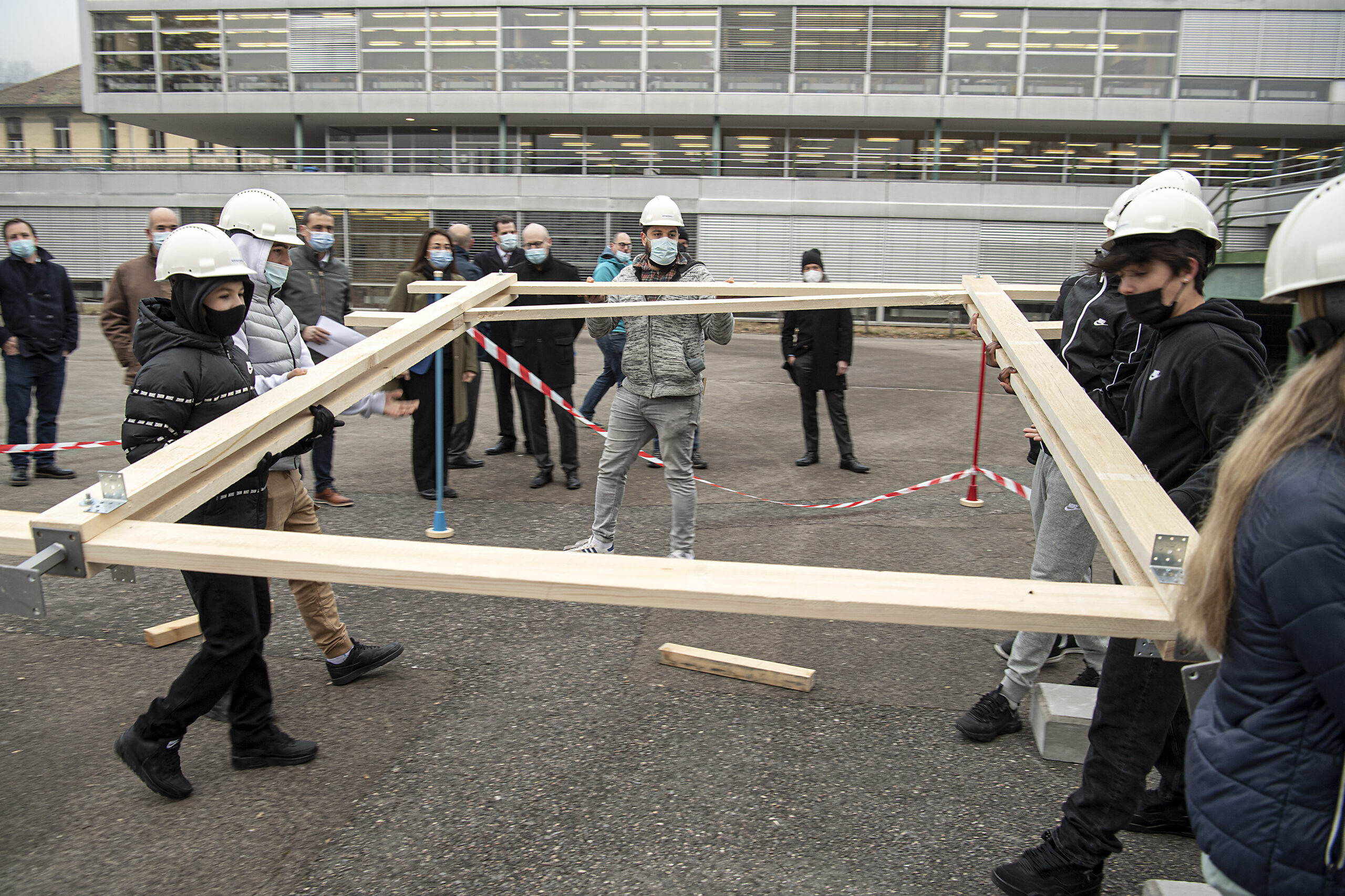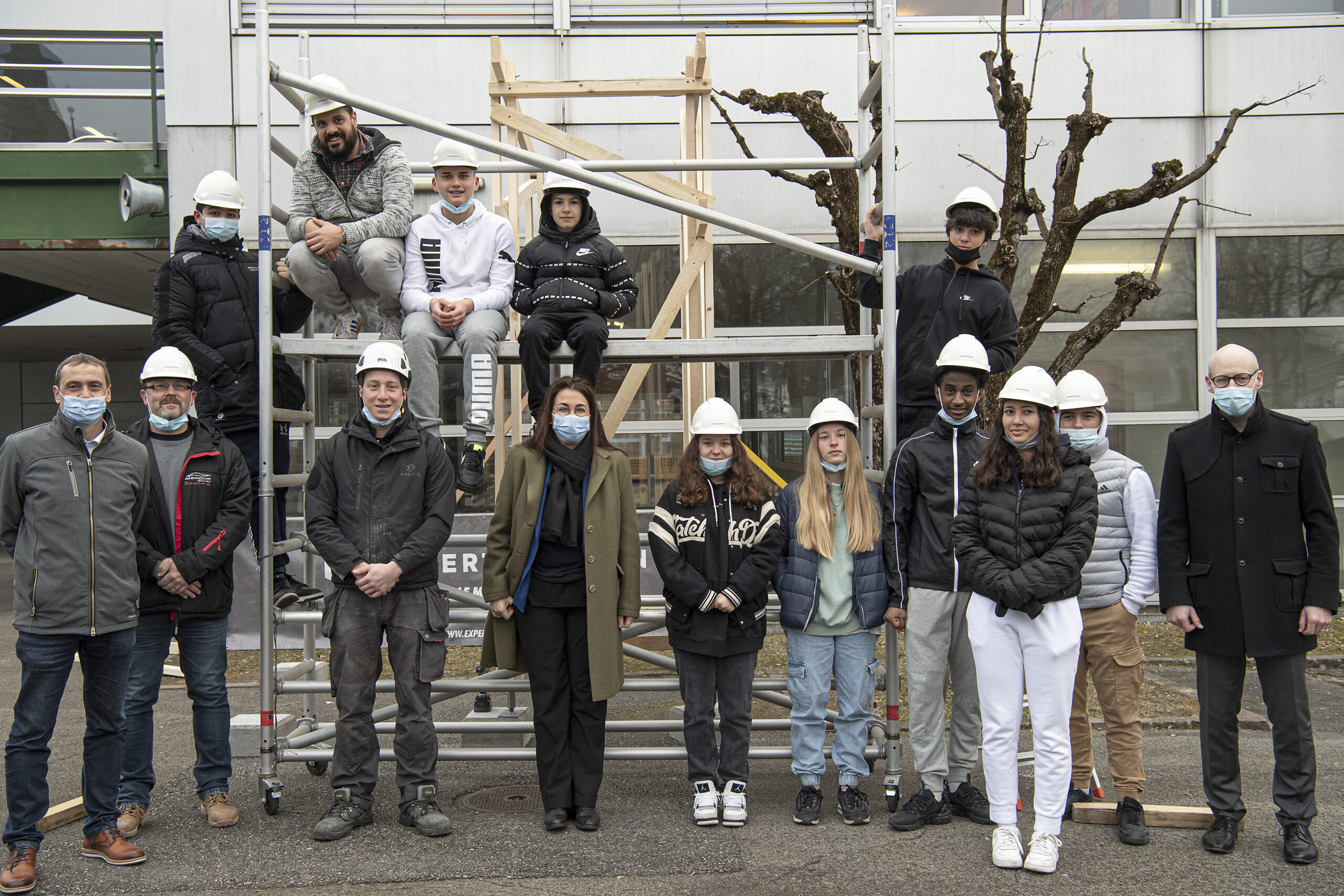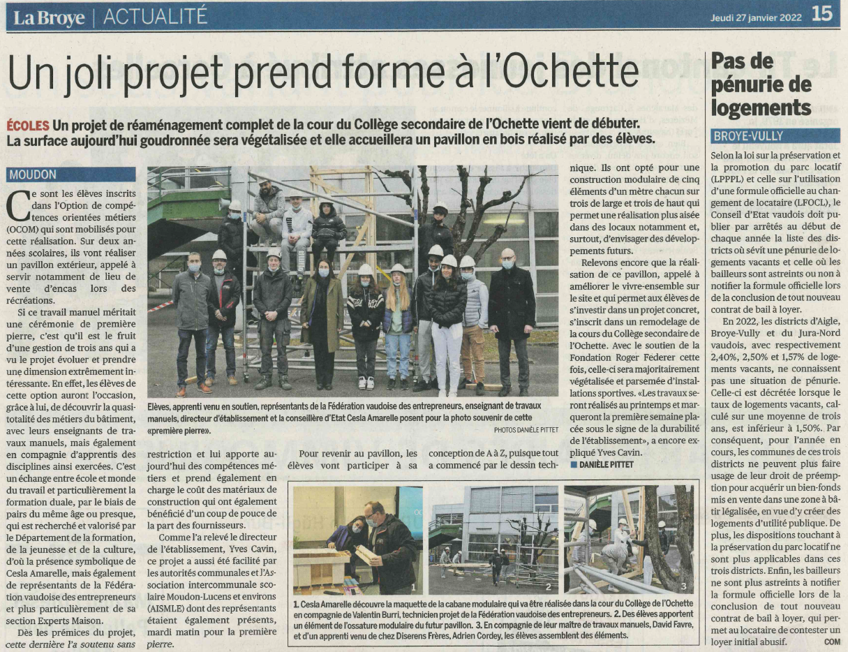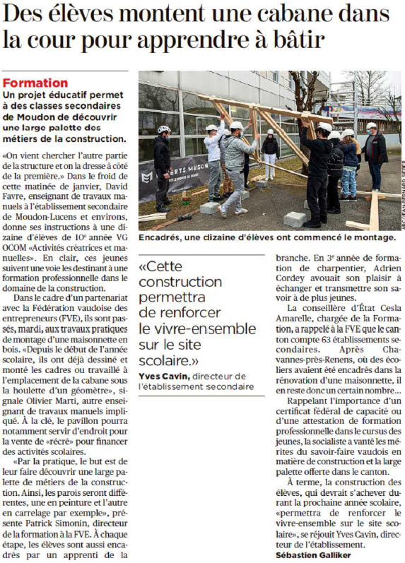 Dans le cadre de son plan d’action de valorisation de la formation professionnelle, le Département de la formation, de la jeunesse et de la culture mène un projet en collaboration avec la Fédération vaudoise des entrepreneurs pour faire découvrir la richesse des métiers de la construction aux jeunes. Après la rénovation d’une maisonnette au collège de la Planta à Chavannes-près-Renens, c’est maintenant une structure en bois qui est construite de toute pièce par un groupe composé d’apprentis et d’élèves à l’Établissement secondaire de Moudon-Lucens et environs.